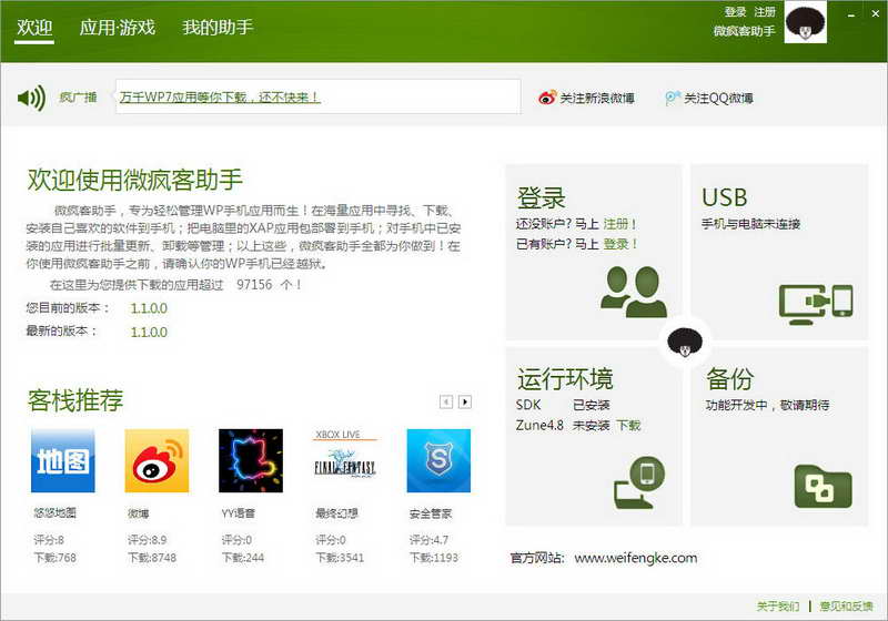 微疯客安装精灵是微疯客自主研发,针对Windows Phone平台的最轻量级应用下载安装工具。通过本软件可以轻松实现应用下载和安装。您可以从微疯客(weifengke.com)找应用,只需轻轻点击“一键安装”,精灵自动帮您安装到手机;也可以将您本地的XAP包批量安装到您手机。