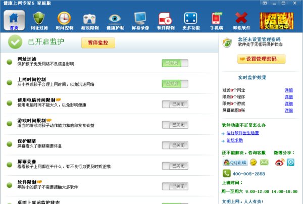 健康上网专家5家庭版是一款具有自动防范黄色有害信息、控制上网时长、控制游戏时长的防沉迷软件,适用于广大家长与教育工作者。使用本软件有助于孩子对上网时间的自我控制,从小养成自律的习惯。软件独有的上网隔离模式,可以保证孩子仅能浏览健康的网站、使孩子能从互联网中获取知识而不会被不良信息毒害。此版本针对家庭用户特别开发,企业用户请安装V3。
