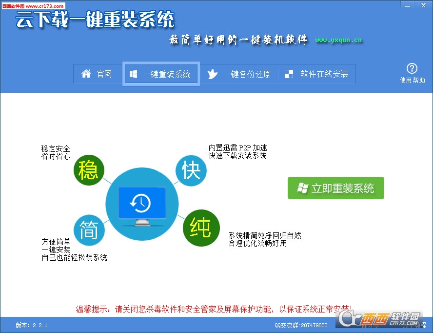 云下载一键装机是一款绿色免费的系统装机工具,它可以一键自动的重装电脑操作系统,,无需光盘,无需U盘,无需任何电脑知识基础,只需轻轻点几下鼠标就可以重装系统啦,非常适合那些对电脑不太了解的人们,省时省心省力。欢迎有需要的朋友们前来下载使用这款云下载一键装机软件。